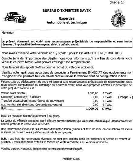 La valeur du véhicule accidenté est à déduire suivant montant qui vous sera communiqué ultérieurement et dont le profit de la vente vous reviendra. "
