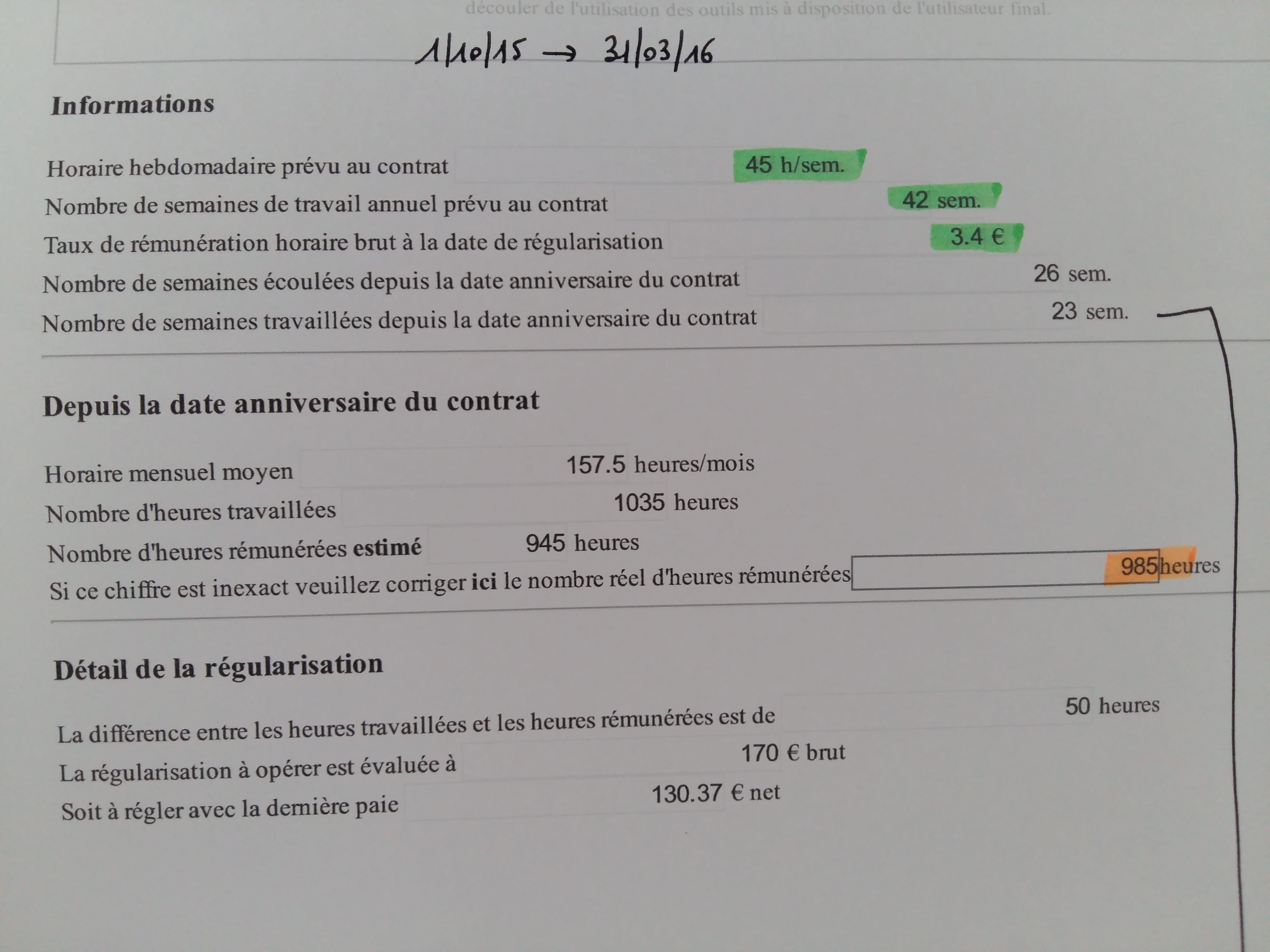 Nous sommes parties sur une année incomplète de 42 semaines, avec un contrat de 45 h par semaine sur 5 jours par semaine, soit un salaire mensuel moyen de 535.50 € net (soit 3.40 € net de l'heure).