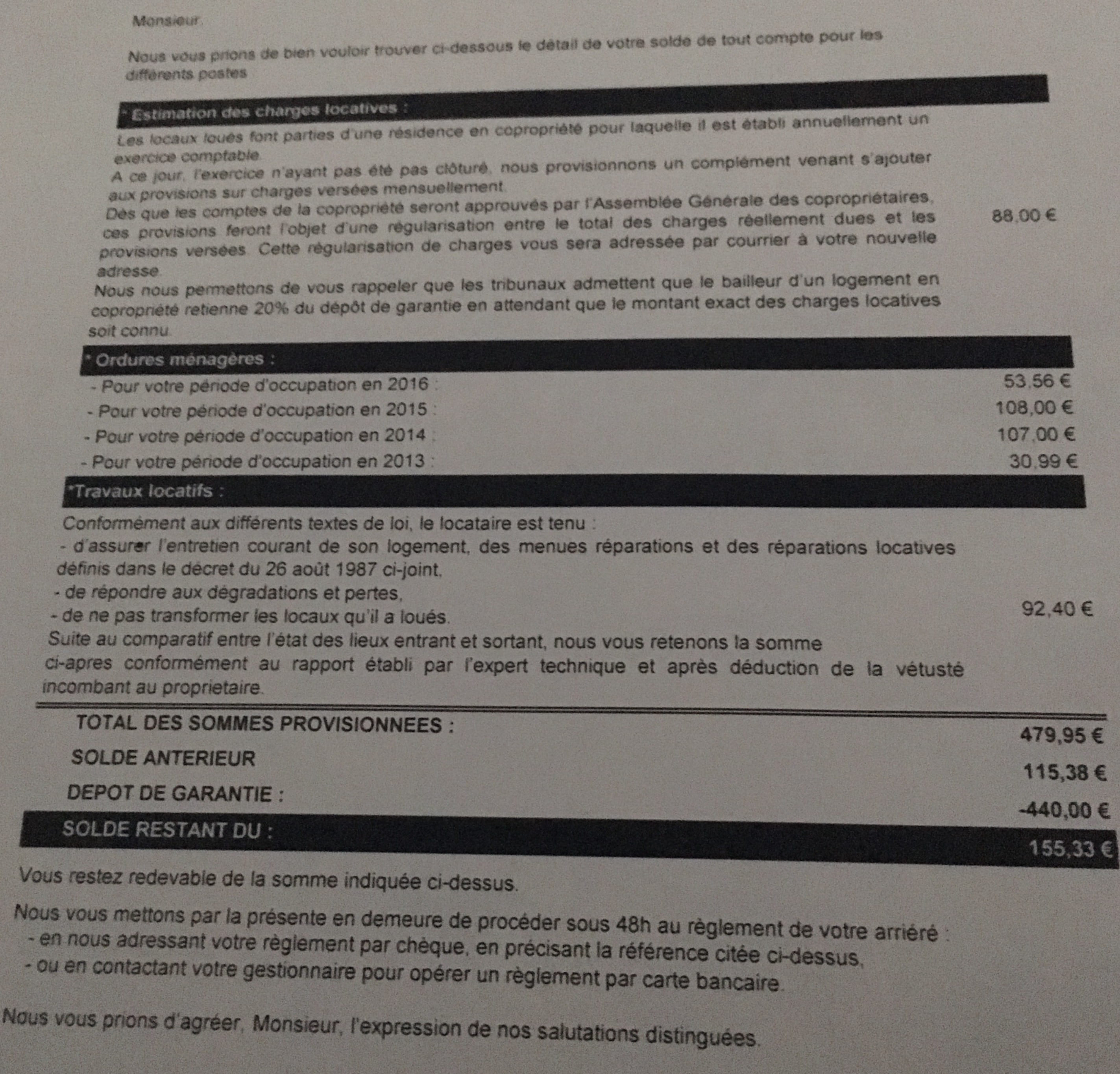 Trouvez vous normal qu'on me demande de payer 3 ans d'ordures ménagère et qu'on me déduis ça de ma caution, un solde antérieur alors que j'ai réglé la totalité du mois et de payer les travaux alors que le rapport dit RAS.