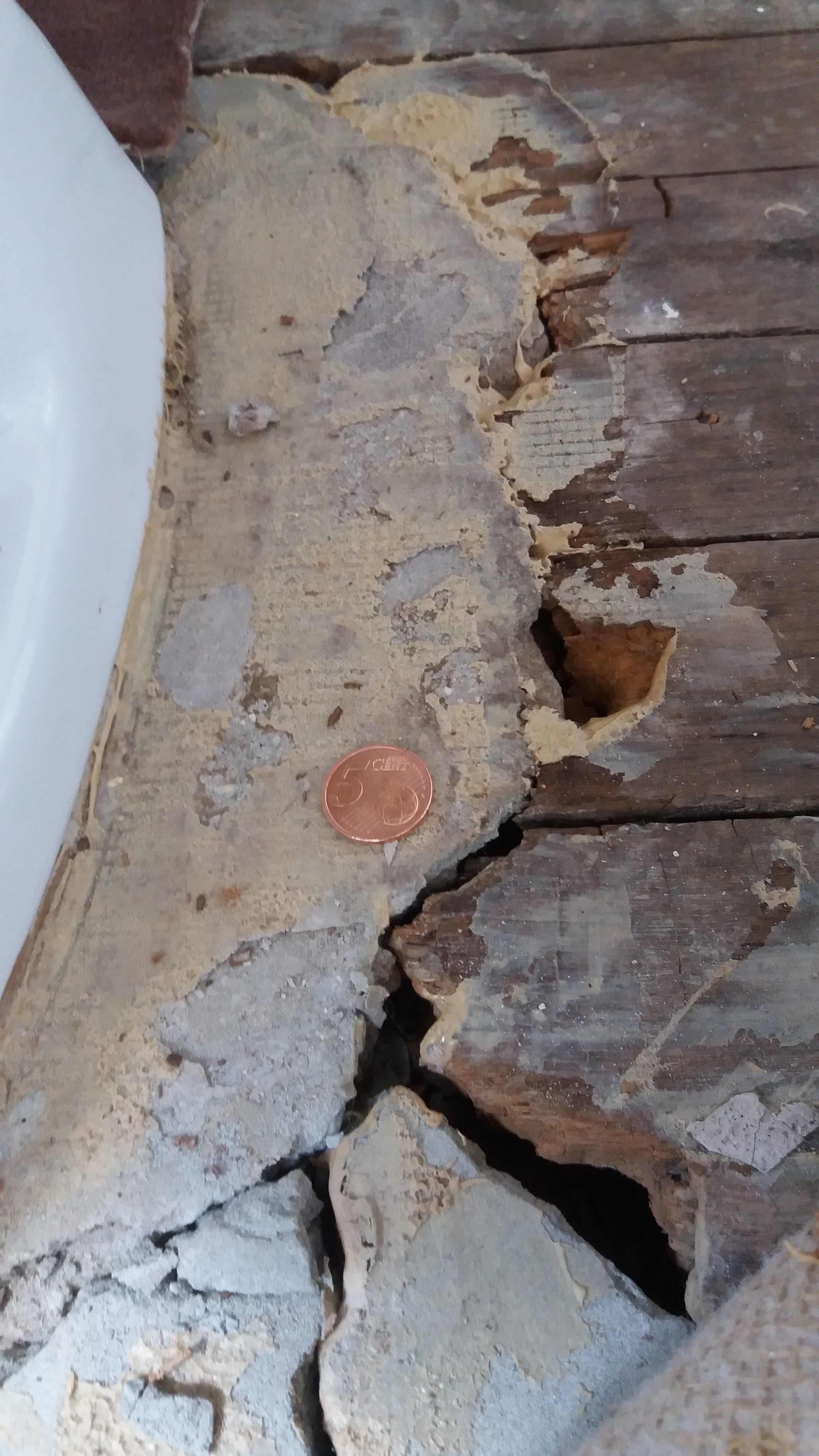 autour des toilettes, le parquet est pourri et part en miette !