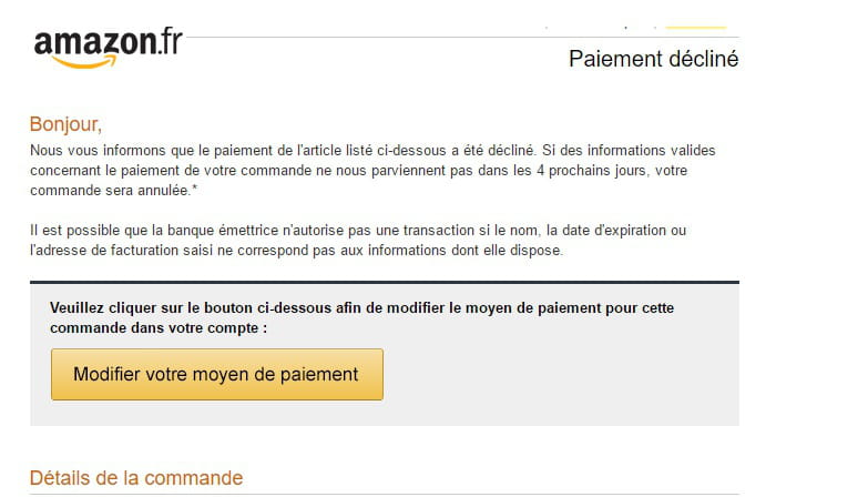 "Nous vous informons que le paiement de l'article listé ci-dessous a été décliné. Si des informations valides concernant le paiement de votre commande ne nous parviennent pas dans les 4 prochains jours, votre commande sera annulée.*