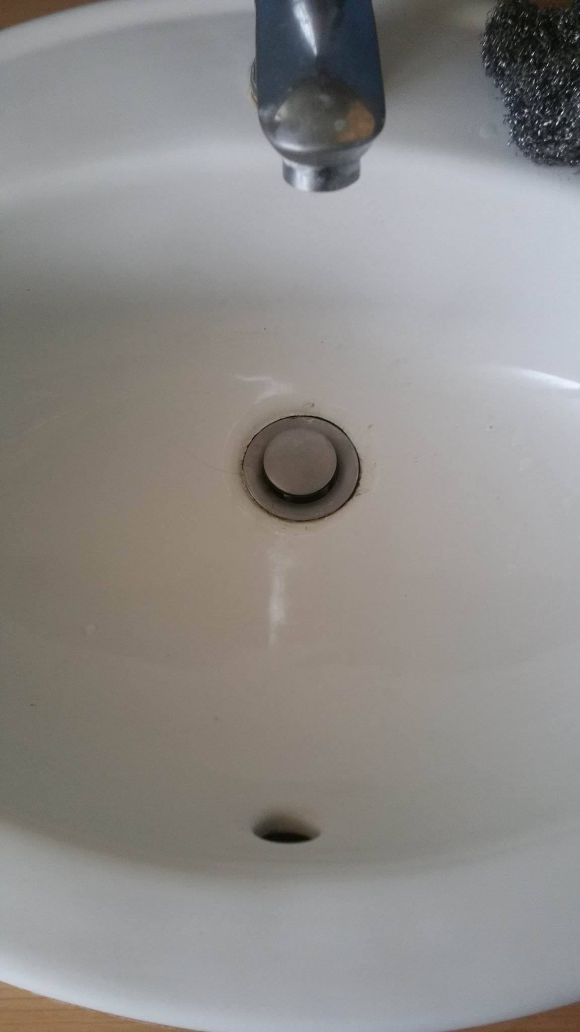 c'est HS mais j'ai constaté une éponge grattoir sur le coté du lavabo, vous savez que ça raye ça, il y a des éponges spéciales pour salle de bain avec le dos blanc, côté grattoir blanc
