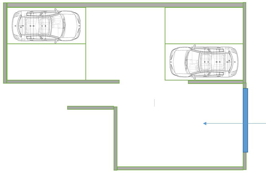 La voie de circulation fait bien 5m mais ce qui m'embête c'est qu'elle traverse une place de stationnement. De l'autre côté le mur coupe la voie de circulation. Je tourne dans tous les sens, mais je n'arrive pas à manœuvrer pour me garer encore plus lorsque que des voitures sont stationnées comme sur le schéma.