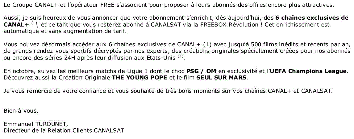 J'étais abonné depuis novembre 2016 à Canal Sat Panorama et les 6 de Canal+ (Canal+ 30 ans et Canal Sat 9 ans) gratuites offertes via mon abonnement à Free Box Révolution tant que je resterai abonné à Free étant partenaire de Canal+.