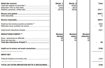 Il a déclaré un revenu de 20 173 € et pour ma part 18 238€, ce qui nous fait un total 38 411€ d’impôt pour 2018. Il faut retiré à cela 95€ de dons.