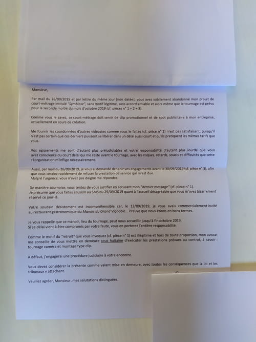 Rien n'a été tourné ni filmé de ce qui est proposé dans le devis (datant d'il y a trois mois). Cependant, je me suis impliqué en lui faisant un geste commercial (deux repérages de tournage, shooting et retouches photo)... Est-ce que cette erreur peut m'être préjudiciable ? Ci-contre l'accusé de réception reçu si vous avez quelques minutes devant vous. En vous remerciant.