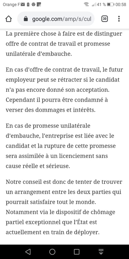 Tout cas parceque je lui ai dit qu une promesse d embauche ou un contrat ne pouvais pas être cassé comme ça. Et que la situation était dur pour les entreprises mais aussi les futurs salariés démissionnaires...