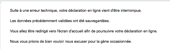 - Suite à une erreur technique, votre déclaration en ligne vient d'être interrompue. les données précédemment validées ont été sauvegardées. vous allez être redirigé vers l'écran d'accueil afin de poursuivre votre déclaration en ligne. nous vous prions de bien vouloir nous excuser pour la gène occasionnée.