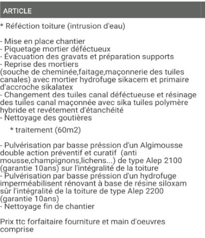j'ai un souci avec un couvreur qui a effectué une réfection de ma toiture suite à une fuite en Avril 2019. Sur la facture, je ne sais pas si le changement et résinage des tuiles défectueuses comprend toute la toiture ou seulement la partie fuite?