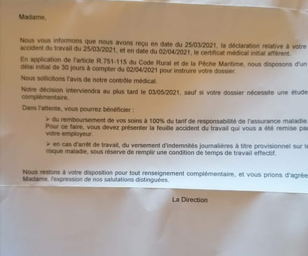 Votre caisse suit la procédure. https://www.ameli.fr/puy-de-dome/entreprise/vos-salaries/accident-travail-trajet/demarches