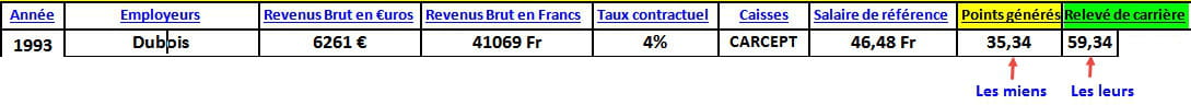 J'ai fais en 2 étapes pour décomposer, puisque le tout en un prête à confusion ;-) Pour rappeler que dans la réalité le calcul des points anciens a été effectué l'année de cotisation, et toutes les conversions vers l'Arrco sont en 1999. Ce sont 2 processus distincts.