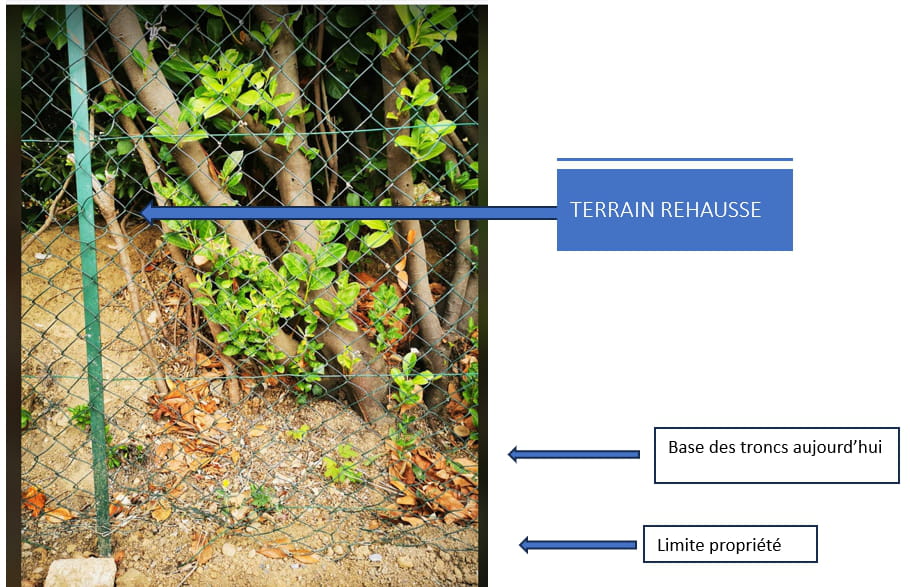 Aujourd’hui (et pour explication) son terrain est au même niveau que le mien en « limite de propriété » et un talus abrupte le fait monter de 80CM (on atteint cette hauteur à 1M20 de la limite de propriété). De ce fait son terrain sur 25 mêtres est de 80cm plus haut que le mien, mais sa haie est pratiquement au même niveau que mon terrain car il a rehaussé le sien après avoir plantée la haie.
