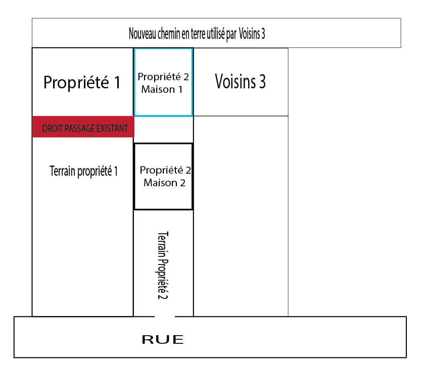 Un droit de servitude a été établi dans le passé pour une maison enclavée en plein milieu du terrain propriété 1. Pour accéder à la maison du fond de la propriété 2.