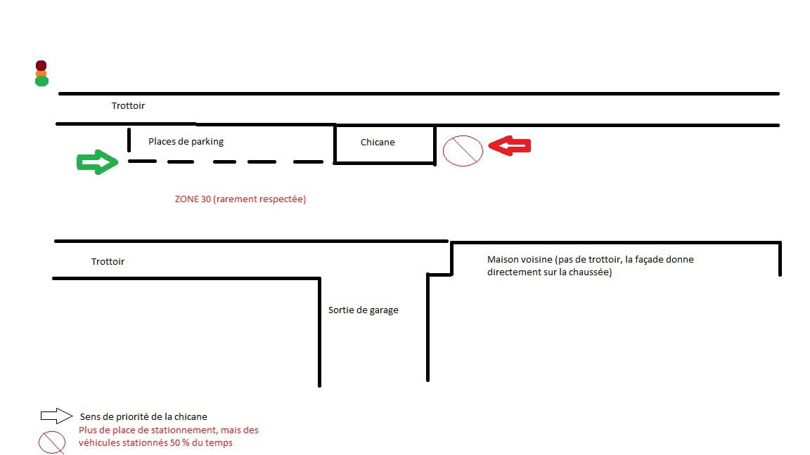 Il s'git d'une zone 30 peu respectée. D'autant moins qu'à gauche de notre sortie, il y a un feu tricolore. Les voitures venant de droite (non prioritaires sur la chicane) accélèrent un grand coup pour le passer.