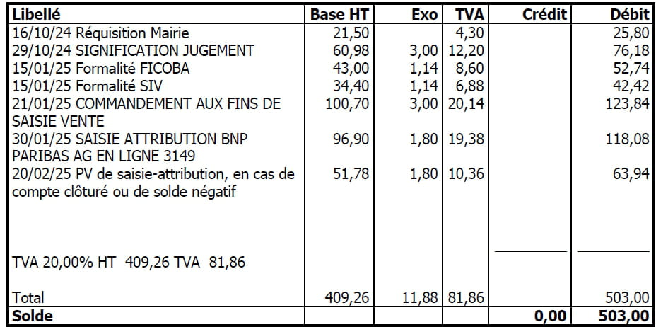 Je me suis alors rapproché d’un commissaire de justice, mais je n’ai pas reçu de devis de sa part avant qu’il ne lance les procédures (voir les documents en photo). Il m’explique aujourd’hui qu’il n’a rien pu saisir sur le compte bancaire de l’artisan.