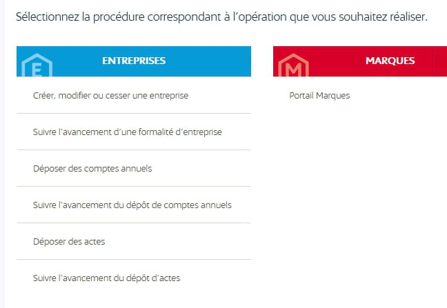 https://procedures.inpi.fr/?%2F= via France connect + pour pouvoir payer les formalités en ligne , vous arriverez alors sur un écran avec cette partie, il faudra sélectionner "créer, modifier ou cesser une entreprise