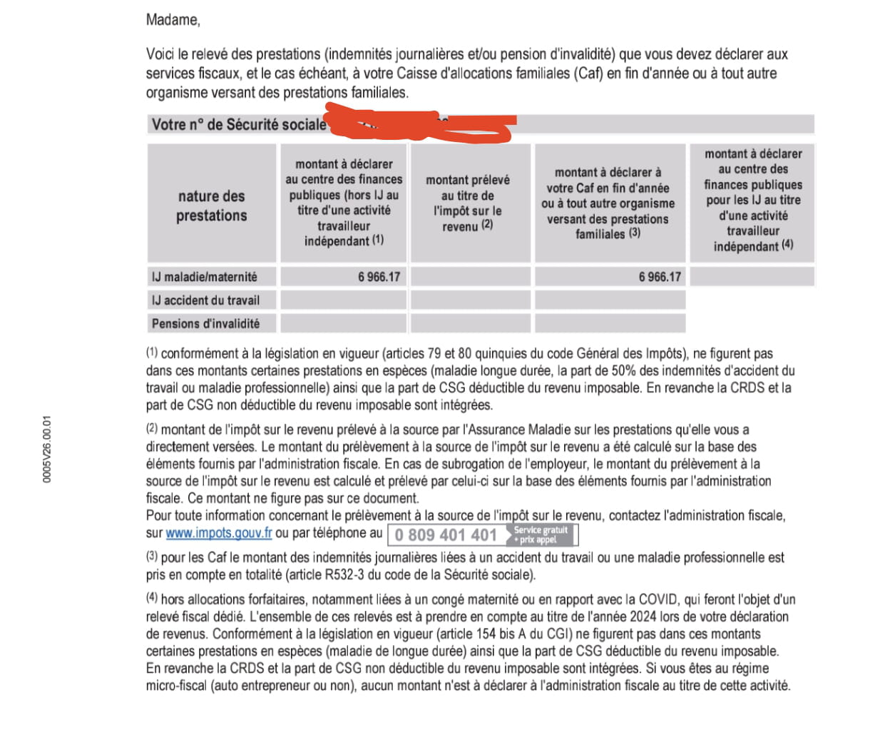 Dans un 1er temps,via votre espace Ameli, mes démarches, attestation d'indemnités journalières, en sélectionnant 2024, vous avez le détail des périodes indemnisées et le montant journalier de l'indemnité. Qu'est-il indiqué ? (car effectivement si vous avez un relevé fiscal cpam avec un montant de 7000 € avec seulement nature des prestations ij maladie pour un arrêt d'un mois, ce n'est pas possible. L'ijss maximale était de 53.31 € sur la période indiquée...)