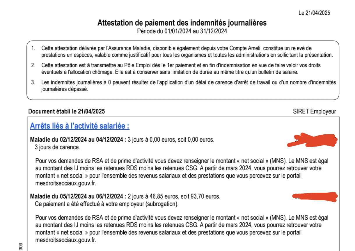 C'était un nouvel arrêt le 2/12/2024 et non une prolongation de votre arrêt du 20/11/2024 ? (vous avez regardé si le numéro de siret correspond bien à celui de votre employeur ?)