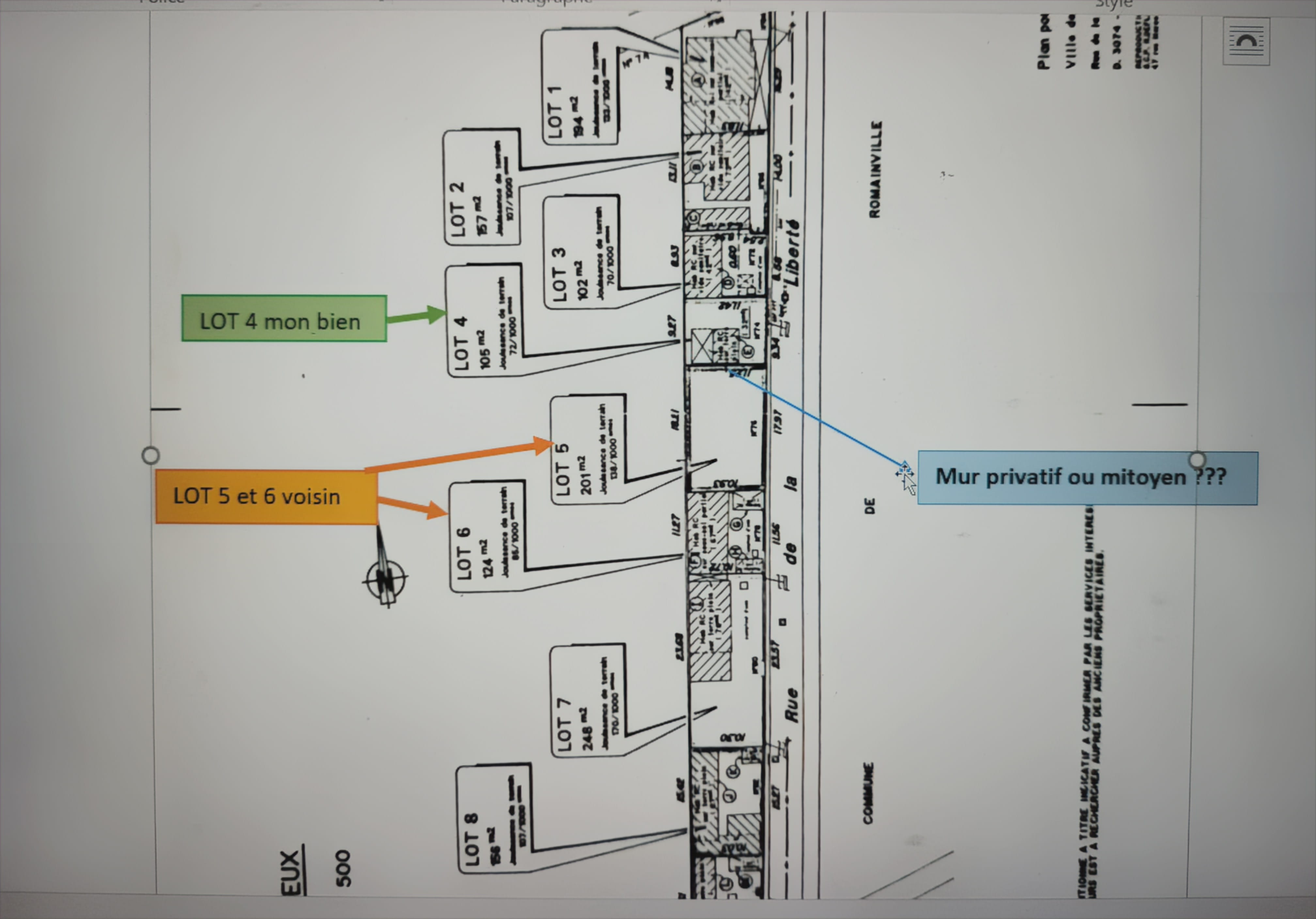 Pourriez-vous m'indiquer selon ces 2 schème entre le lot 4 ( ma propriété) et les lot 5 et 6 ( mon voisin) correspond t 'il à un mur mitoyen ou privatif. A savoir , que mon bien se situe sur une copropriété à l'horizontale depuis 1989 ou chacun des copropriétaire jouisse individuellement de leur bien avec aucune partie commune. Donc pas de syndic. Je ne dispose d'aucun document déterminant le statut de ce mur ( non indiqué dans l'acte propriété). Cependant il dispose de toute les caractéristiques d'un mur privatif :