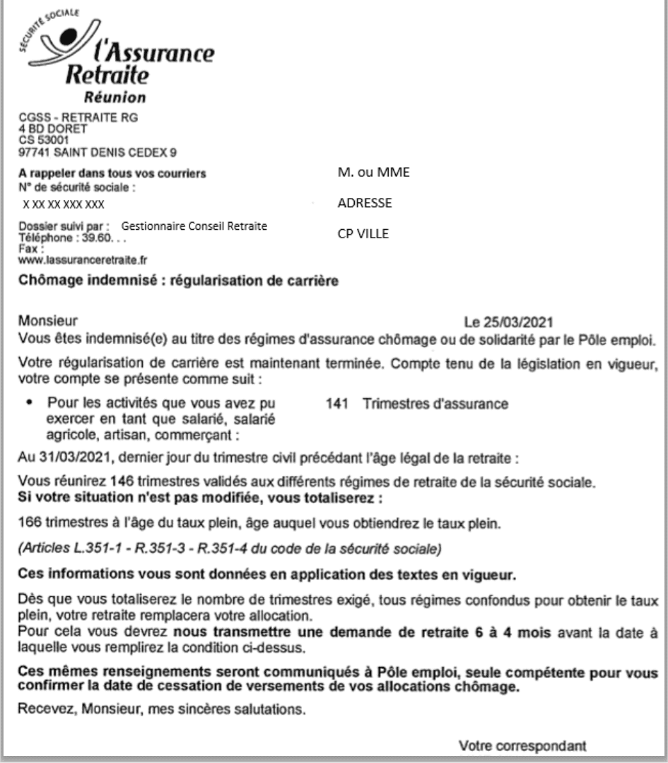 Un lien indiqué envoie sur le site de la cgss de La Réunion avec un exemple d'attestation "Chômage indemnisé Régularisation de carrière" et ce document figure bien le nombre de trimestres.