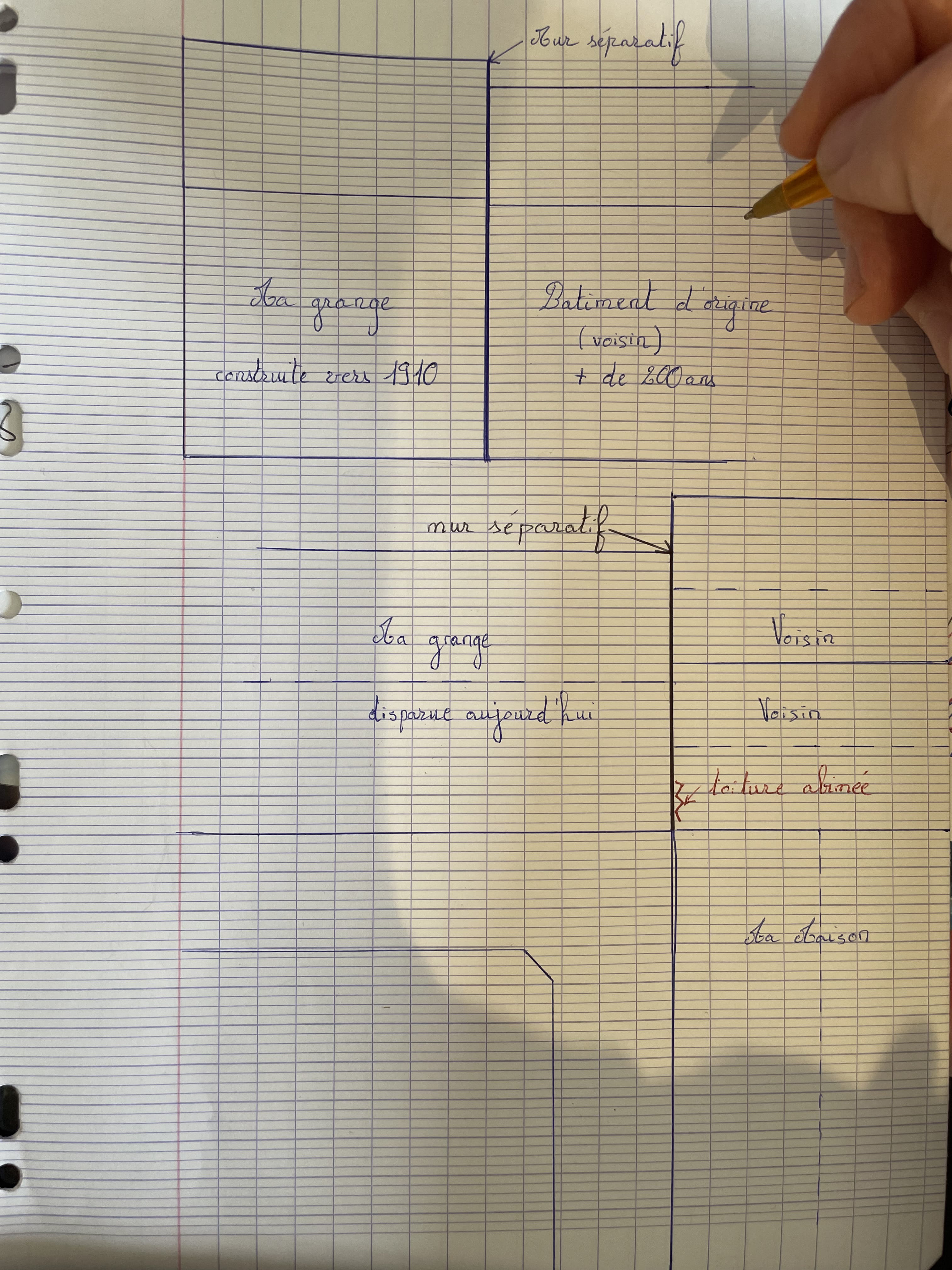 J’habite dans un ancien corps de Ferme. Celui-ci a été divisé en deux. A l’achat de la maison, je disposais d’une grange.les autres bâtiments ayant été racheté par la Maison se situant derrière moi. Ma grange devenue branlante a fini par tomber. Par sécurité, J’ai coupé ce qui était rattacher au pignon pour éviter que les poutres tirent dessus, et face tout écrouler. Il ne me reste donc qu’un seul mur, cependant celui-ci n’est pas tombé car il est rattaché au bâtiment du voisin. Je souhaiterais dans un futur proche, construire une extension qui remplacera l’ancienne grange, le problème et que le mur qui est resté debout est abîmé. De plus, le bâtiment faisant partie de ce mur commence à montrer de l’usure, notamment au niveau de la toiture. Et le souci est que je souhaiterais faire mon extension le long de ce mur, car l’agencement de mon terrainFait que quoi qu’il arrive, je vais me retrouver en porte-à-faux avec les bâtiments du voisin.