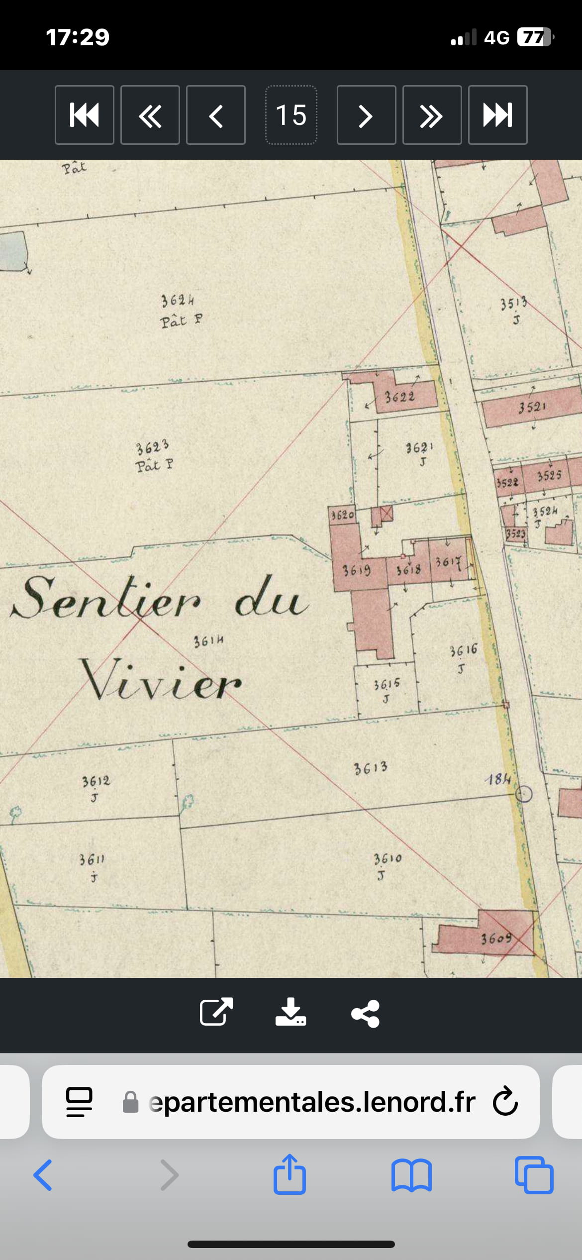 Je pense qu'il s'agit d'un mur séparatif, surtout qu'a l'époque tous les bâtiments faisaient partis du corps du ferme. Les nouvelles constructions sont venues se superposer au vieux bâtiment (vers 1910). Le nouveau bornage qui à due être modifié quand le voisin à acheté (dans les années 70-80) n'est pas visible.
