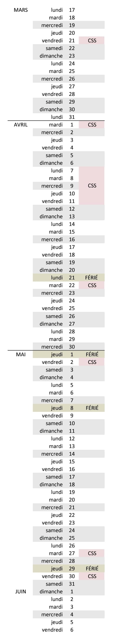 - du mardi 27 au vendredi 30 mai (période comprenant le mercredi habituellement non travaillé et un jour férié)