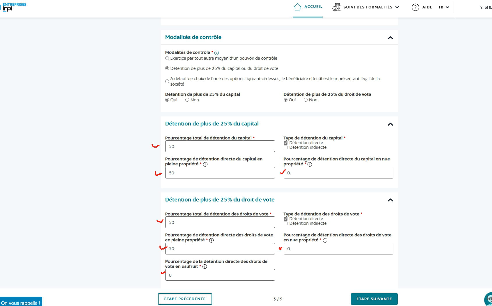 Dans l'étape de bénéficiaires effectifs de l'INPI, sachant que moi et ma femme ont 50% parts sociales de chacun, j'aimerais savoir si je dois remplir le pourcentage de détention directe du capital en pleine propriété à 50, pourcentage de détention directe du capital en nue propriété à 0? Car à la création de la SCI, le démembrement de propriété n'a pas encore été fait.