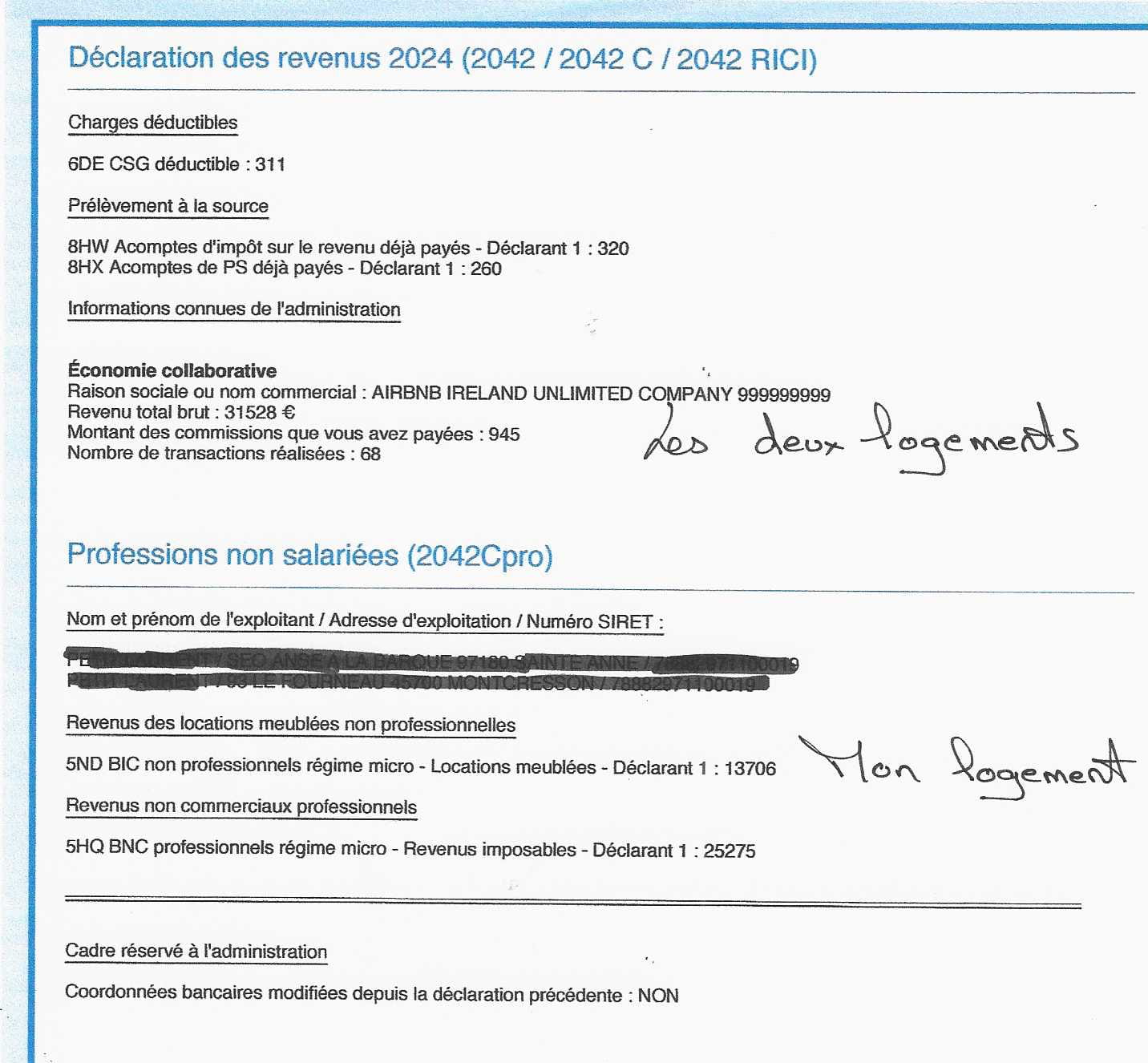 En recherchant l'erreur j'ai constaté que dans la déclaration de revenu , les impots me compte une première fois Le cumul des revenus des deux logements puis dans le cerfa 2042C Pro dans la rubrique non salarié il comptabilise aussi les revenus de mon logement
