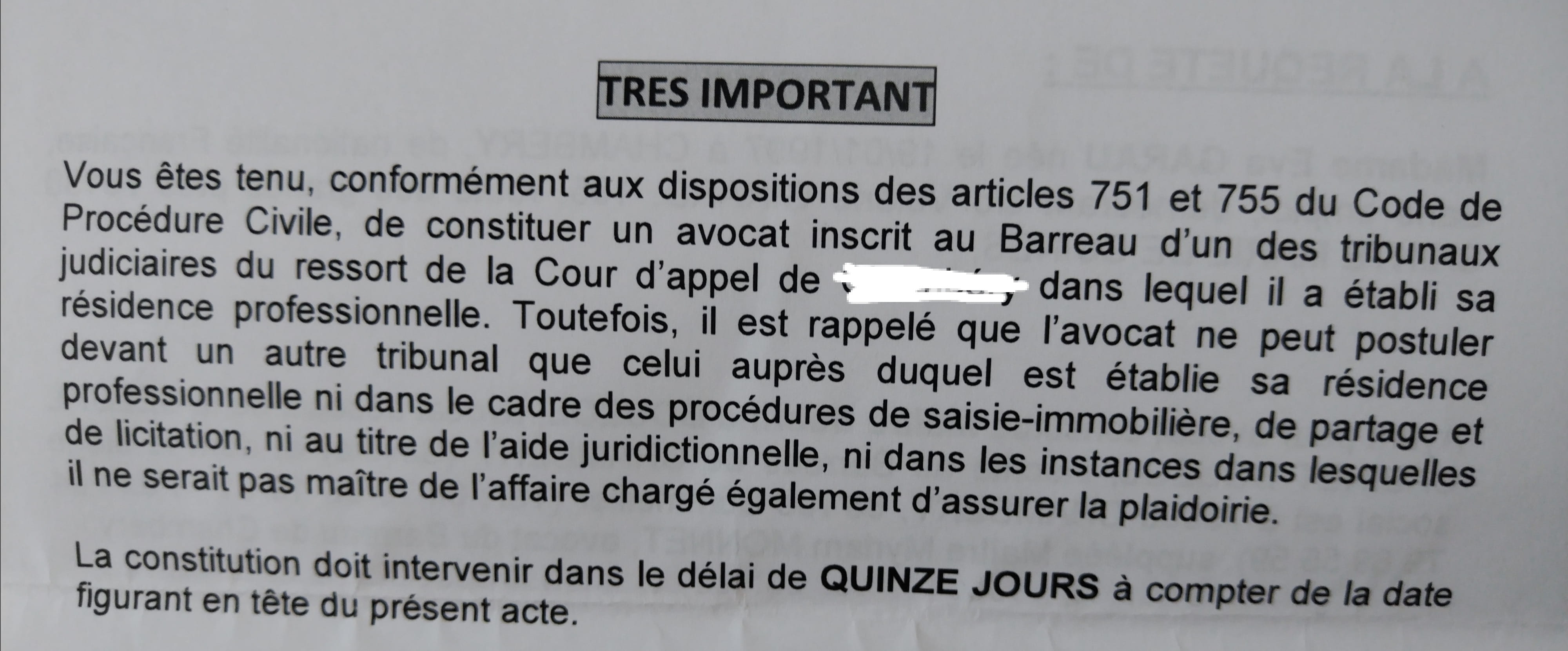 Et, étant en déplacement, je n'ai reçu l'assignation que 10 jours après le dépôt par huissier. Il ne me reste donc que 4 jours pour trouver un avocat.