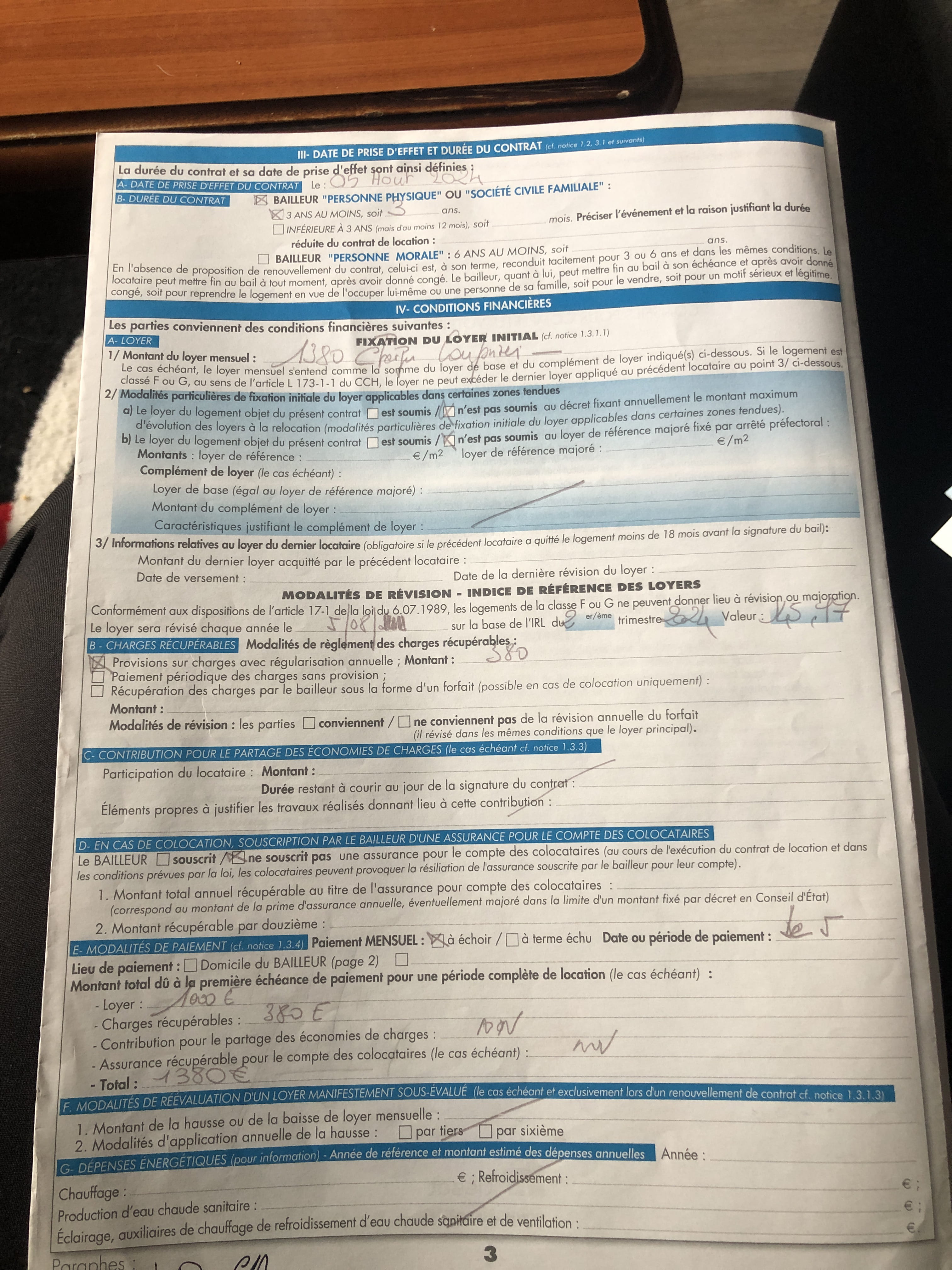 mon loyer est de 1000€ et les charges ( eau, EDF, gaz, taxe d’ordures ménagères) sont de 380€.