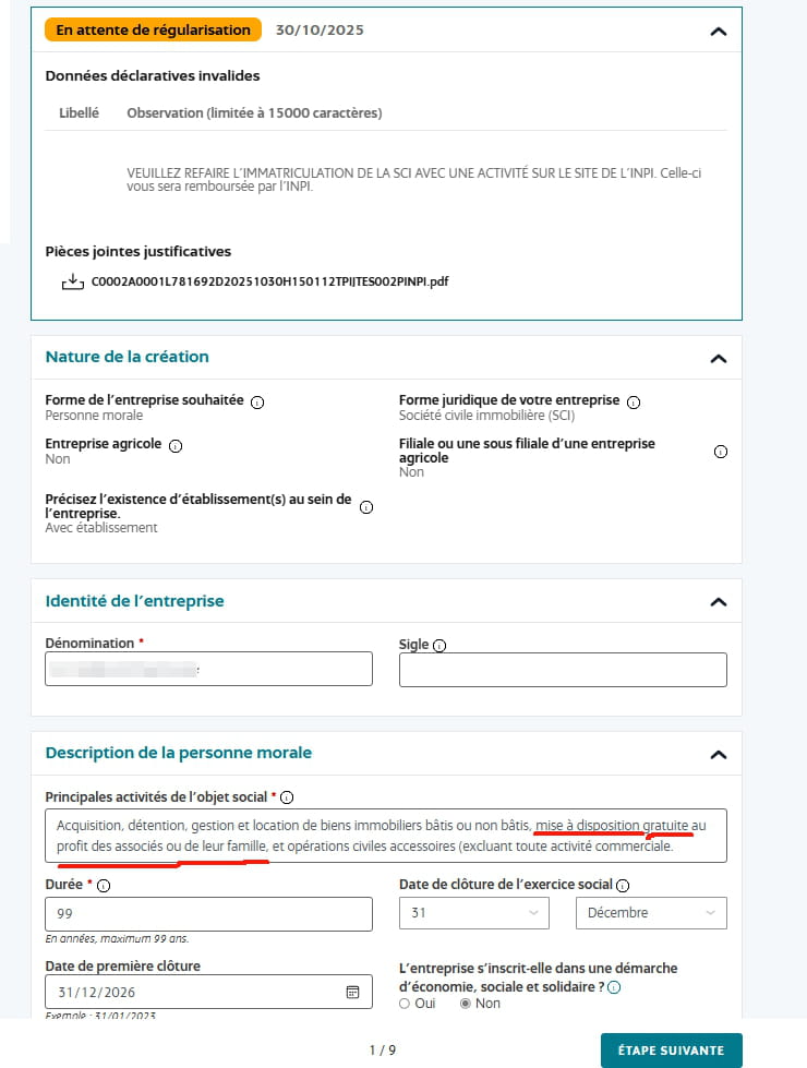 • VEUILLEZ REFAIRE L'IMMATRICULATION DE LA SCI AVEC UNE ACTIVITÉ SUR LE SITE DE L'INPI.