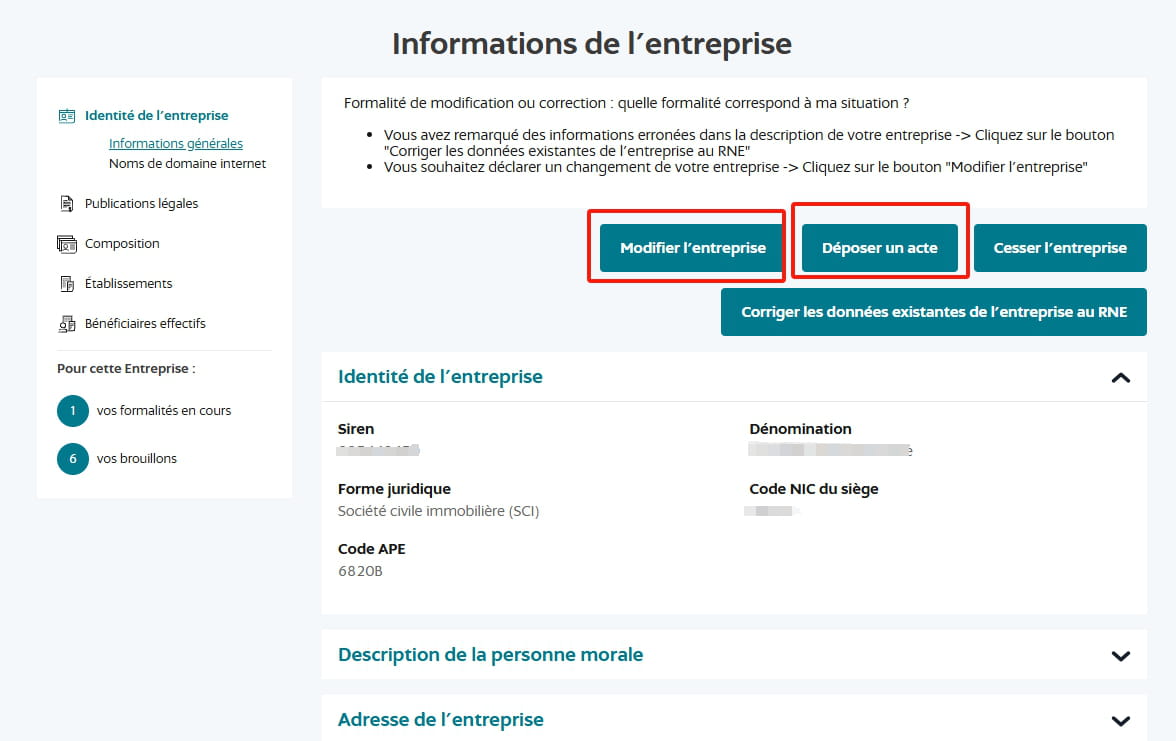 - Choix entre Modifier l’entreprise et Déposer un acte à INPI