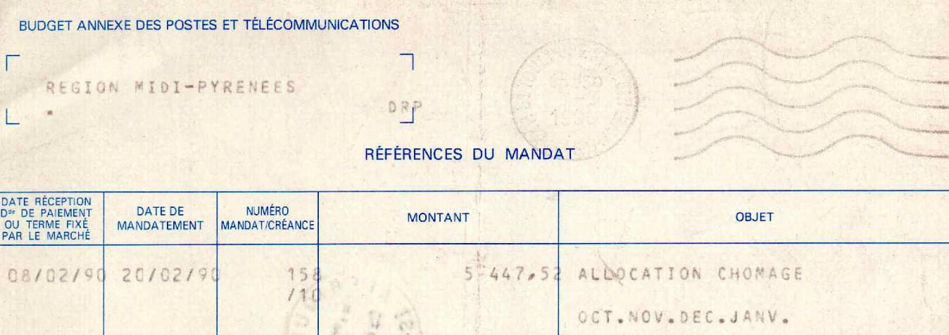 Le mandat de versement de la deuxième période de chômage indemnisé ci dessous date aussi de 1990 et fait apparaître le montant en francs de l'indemnisation avec la période oct nov dec et jan.
