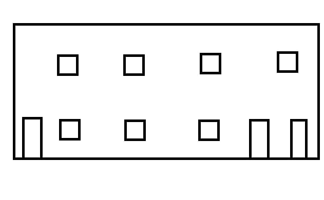 Voici un dessin de sa façade. Etant donné qu'il rentrait toujours par la porte de droite j'ai décidé de mettre ma voiture devant cette porte (qui s'ouvre vers l'interieur donc il peut l'ouvrir mais ne peut pas sortir). C'est aujourd'hui que des gendarmes sont venus à ma porte pour me demander d'enlever ma voiture car si il y a un incendie et que ma voiture l'empêche de sortir alors je suis fautif.