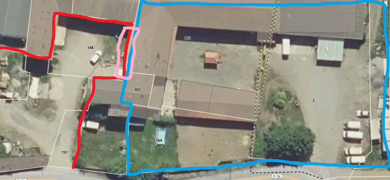 Il y a 10 ans ce voisin a commencé à passer par les parcelles rouges 151, 150 et 148 pour entrer chez lui alors que son entrée est normalement à droite de l'image dans les parcelles 2 et 403. Ne voulant pas faire d'histoire, personne n'a rien dit.