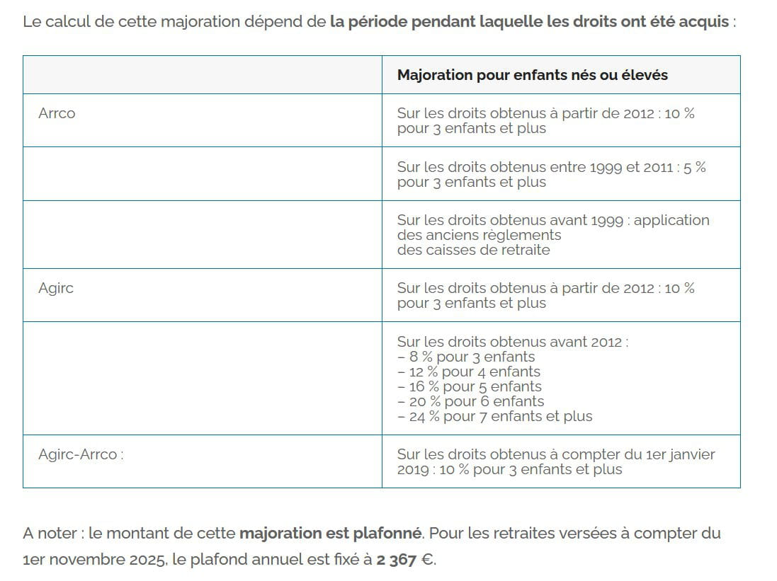 Avant 1999 (fusion d'une quarantaine de caisses dans l'Arrco) chaque caisse avait ses règles, majoration ou pas, taux, nombre d'enfants ... De 1999 à 2011, avec 3 enfants 5% de majoration. Et de 2012 à 2014, 10%. Il n'y a donc pas un calcul global. Mais au moins 3 calculs pour chacune des périodes, et potentiellement plus avant 1999 suivant les caisses auxquelles vous étiez affilié.