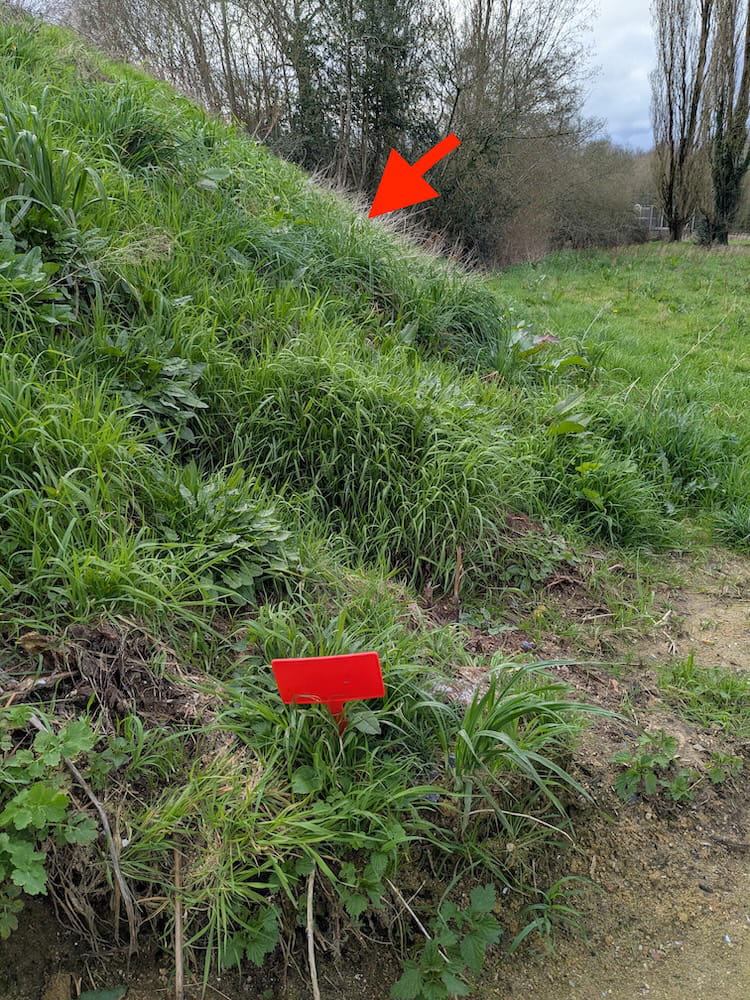 La mairie a nettoyé le talus et l'on voit à présent très bien les bornes. Sauf que le talus qui surplombe notre terrain d'environ deux mètres ne m'appartient pas. car le démarrage du talus (le haut) est sur le terrain du dessus, un terrain de la mairie.
