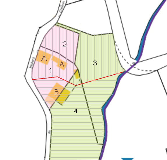 Je souhaite acheter un bien immobilier. Le propriétaire vend les bâtiments A (maison d'habitation + dépendance) et B (grange) séparément, qui se situent sur le même terrain n°1. Il prévoit donc de faire une division parcellaire. En rose les terrains sont en zone Ua, en vert en zone A.